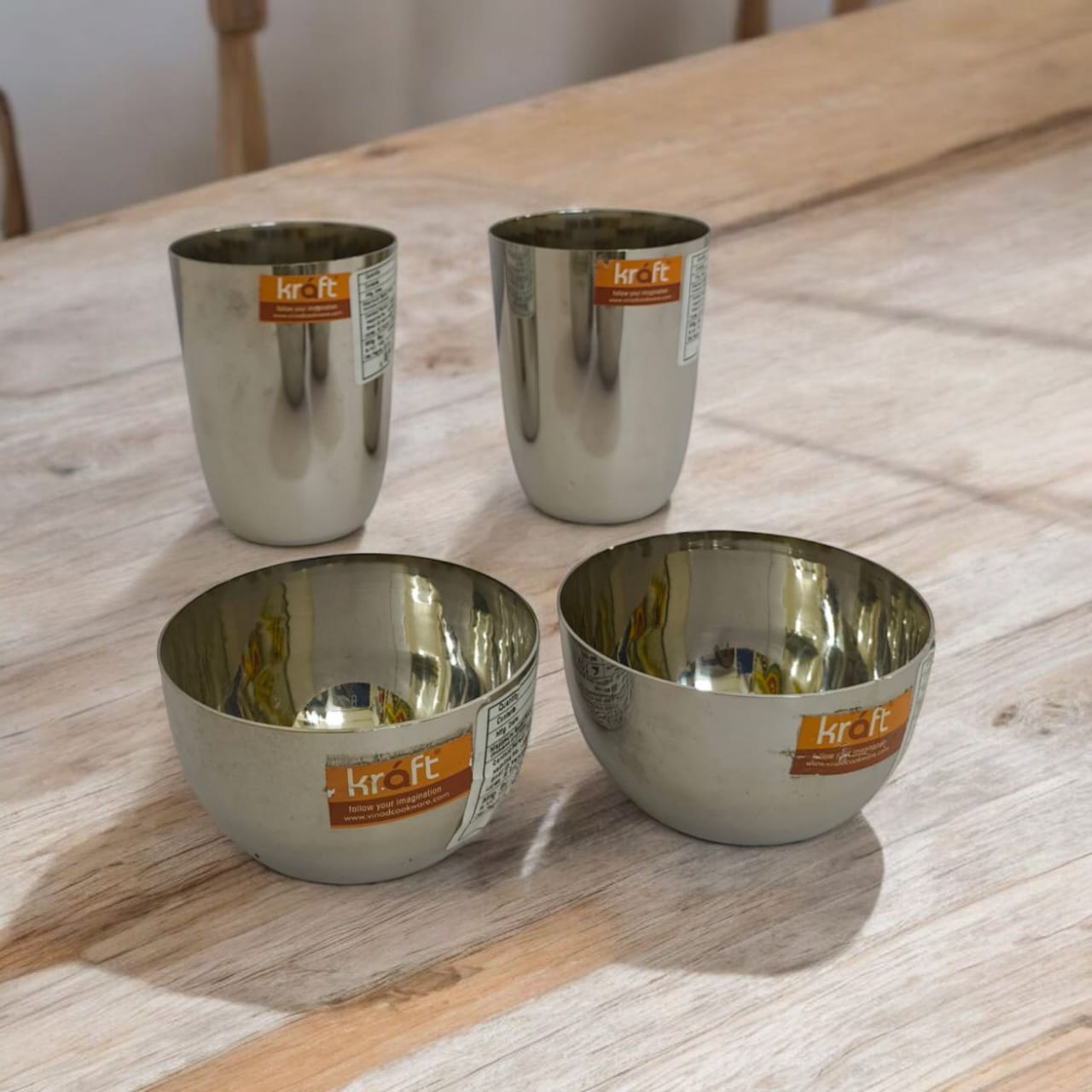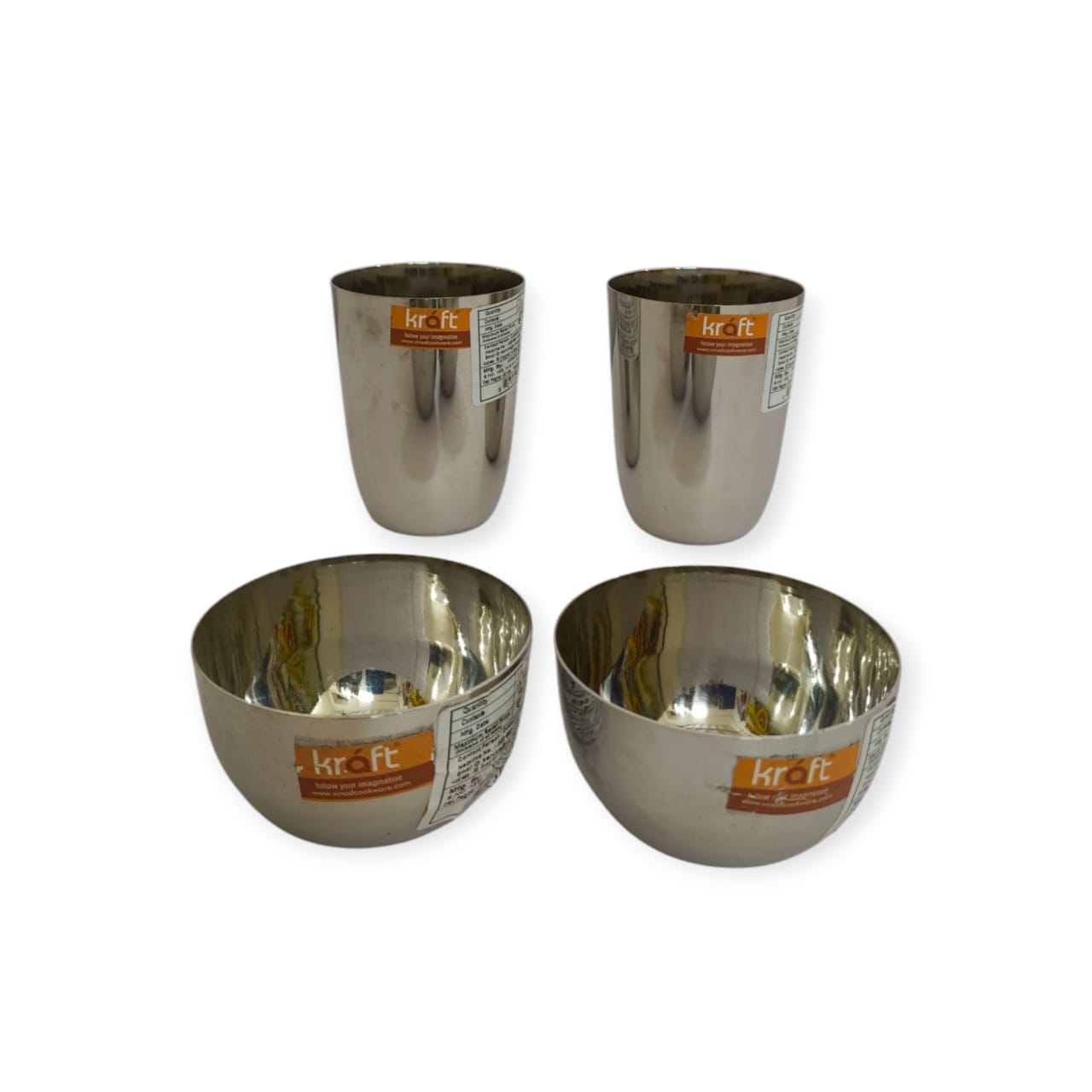 Kraft Stainless Steel Drink & Serve Set – Set of 4 | 2 Tumblers + 2 Bowls | Rust-Free & Food-Grade